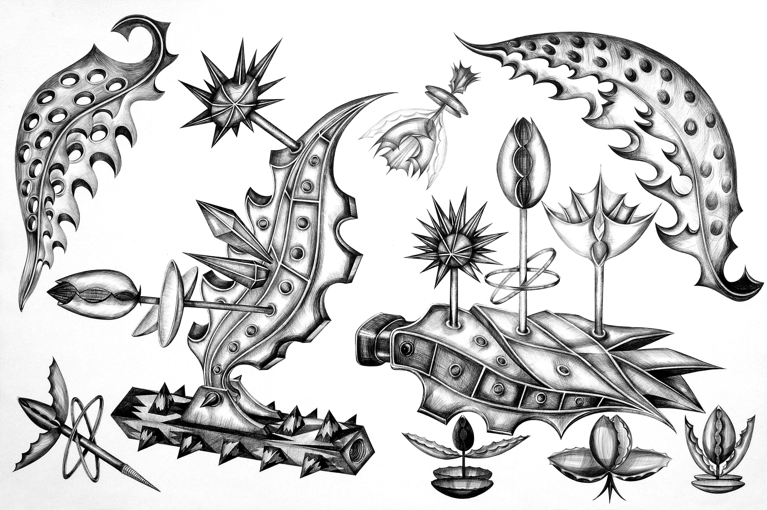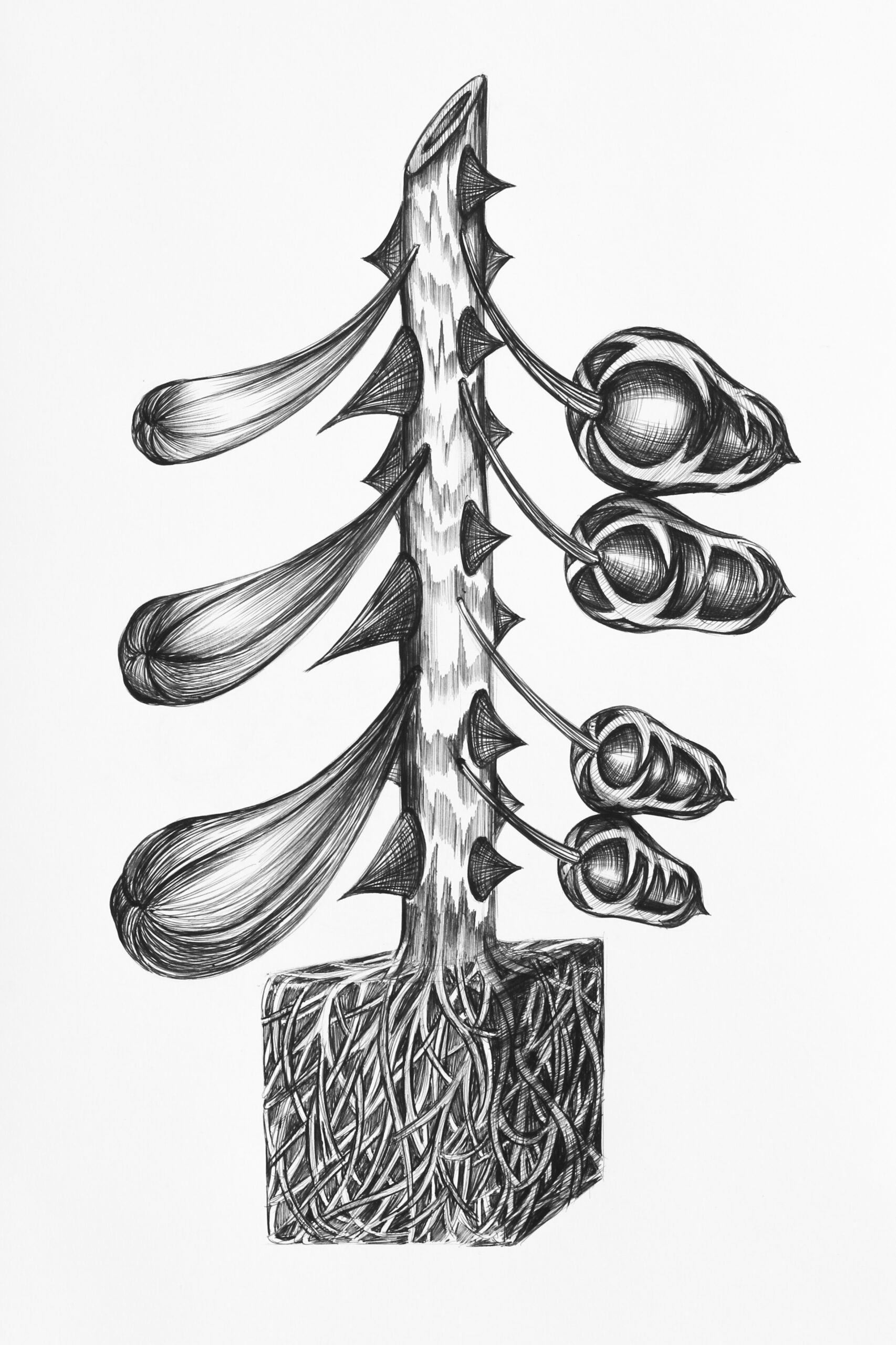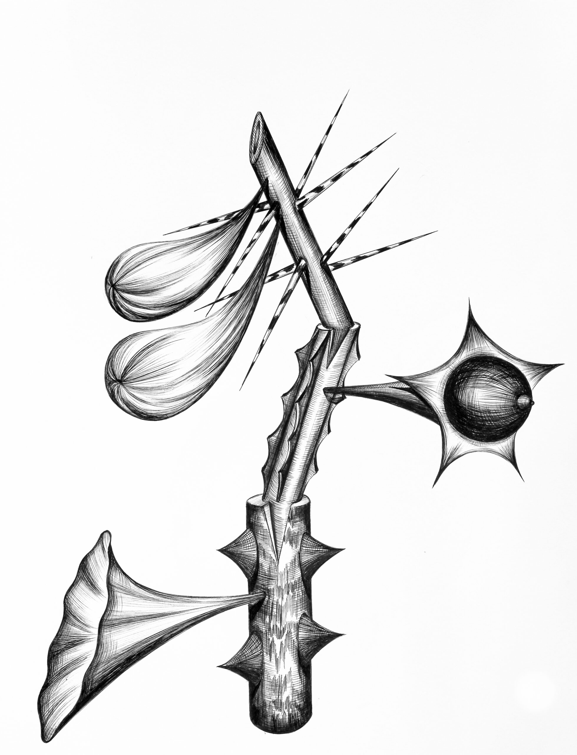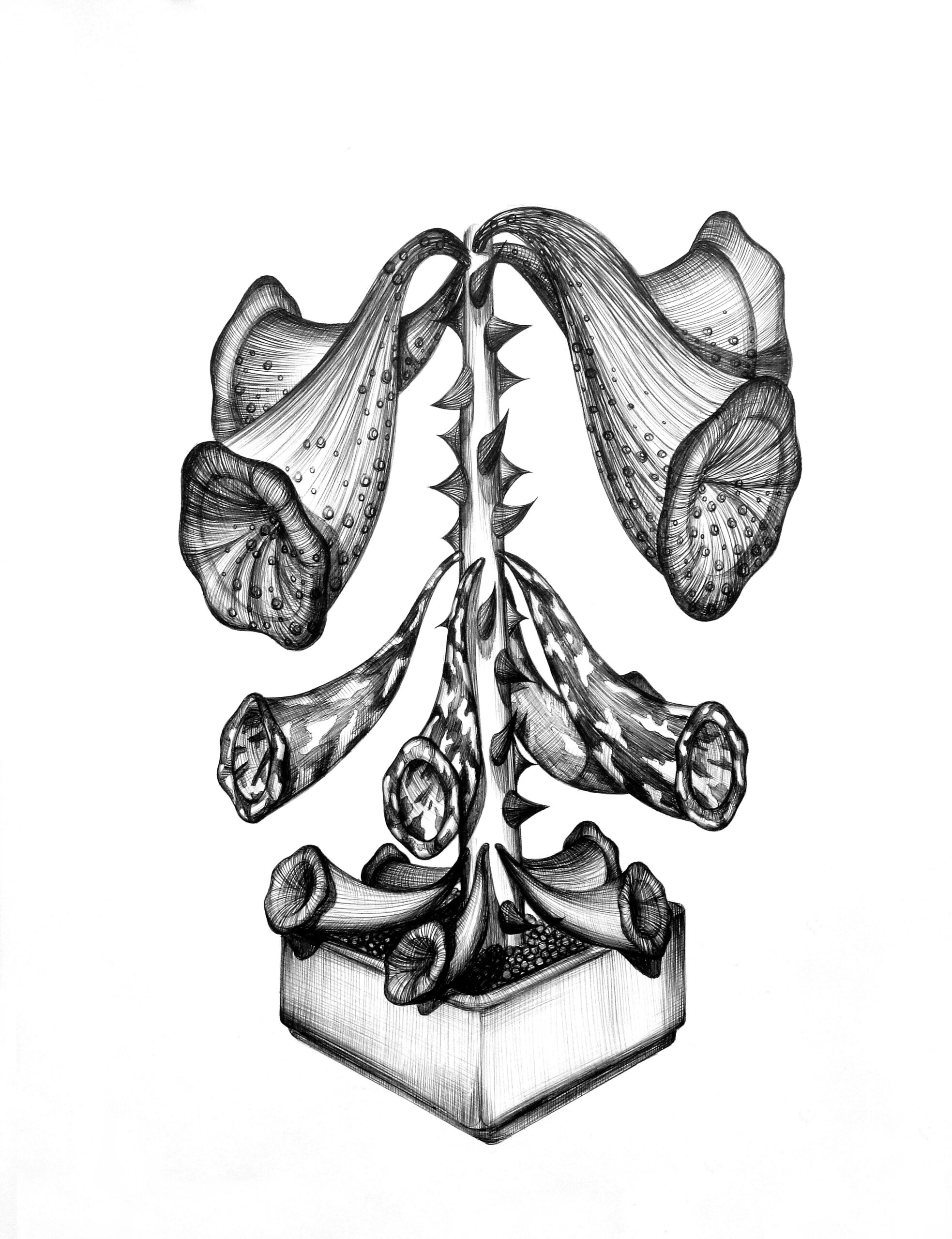 Serie digitale tekeningen van hybride plantmodellen die balanceren tussen natuur en kunstmatigheid,