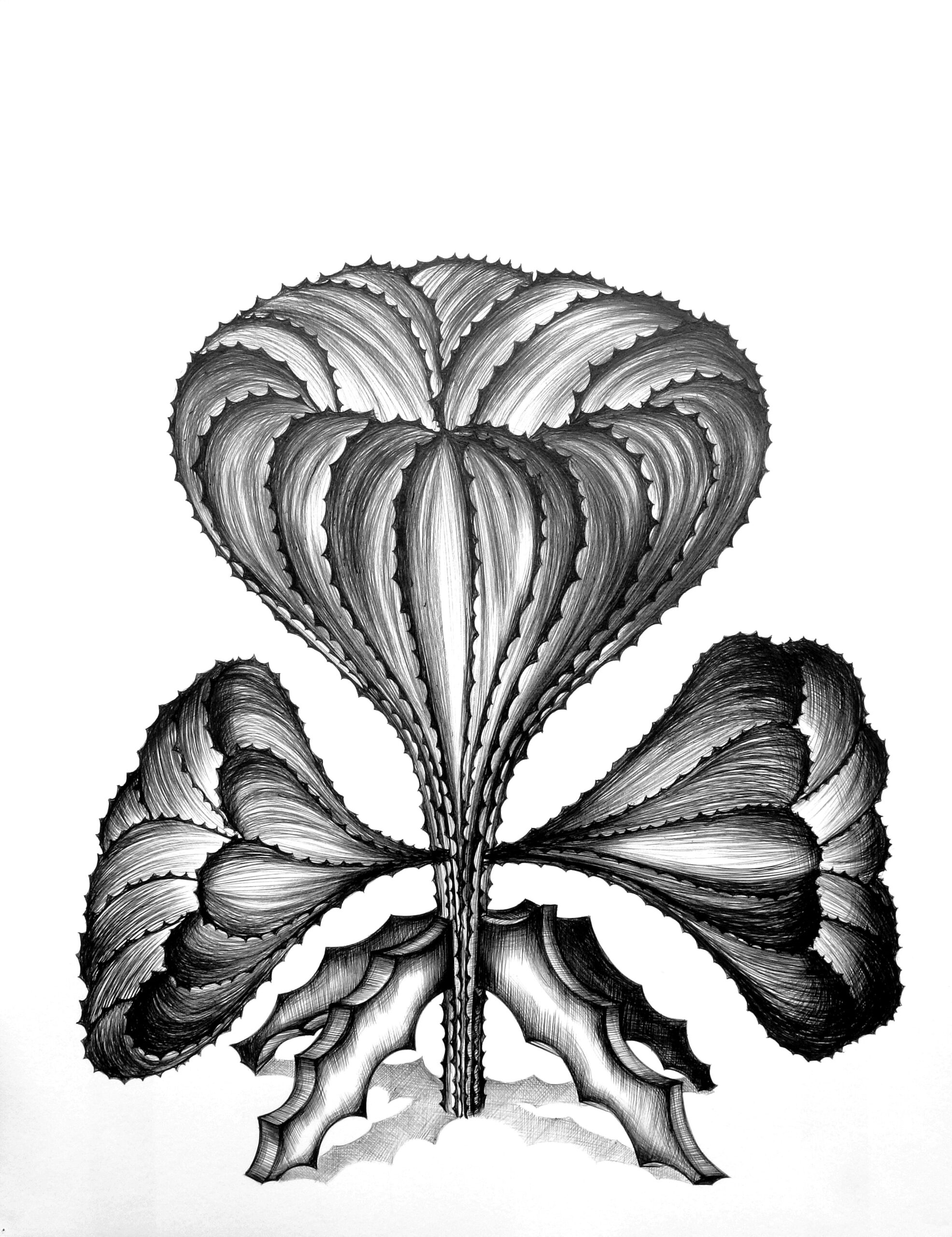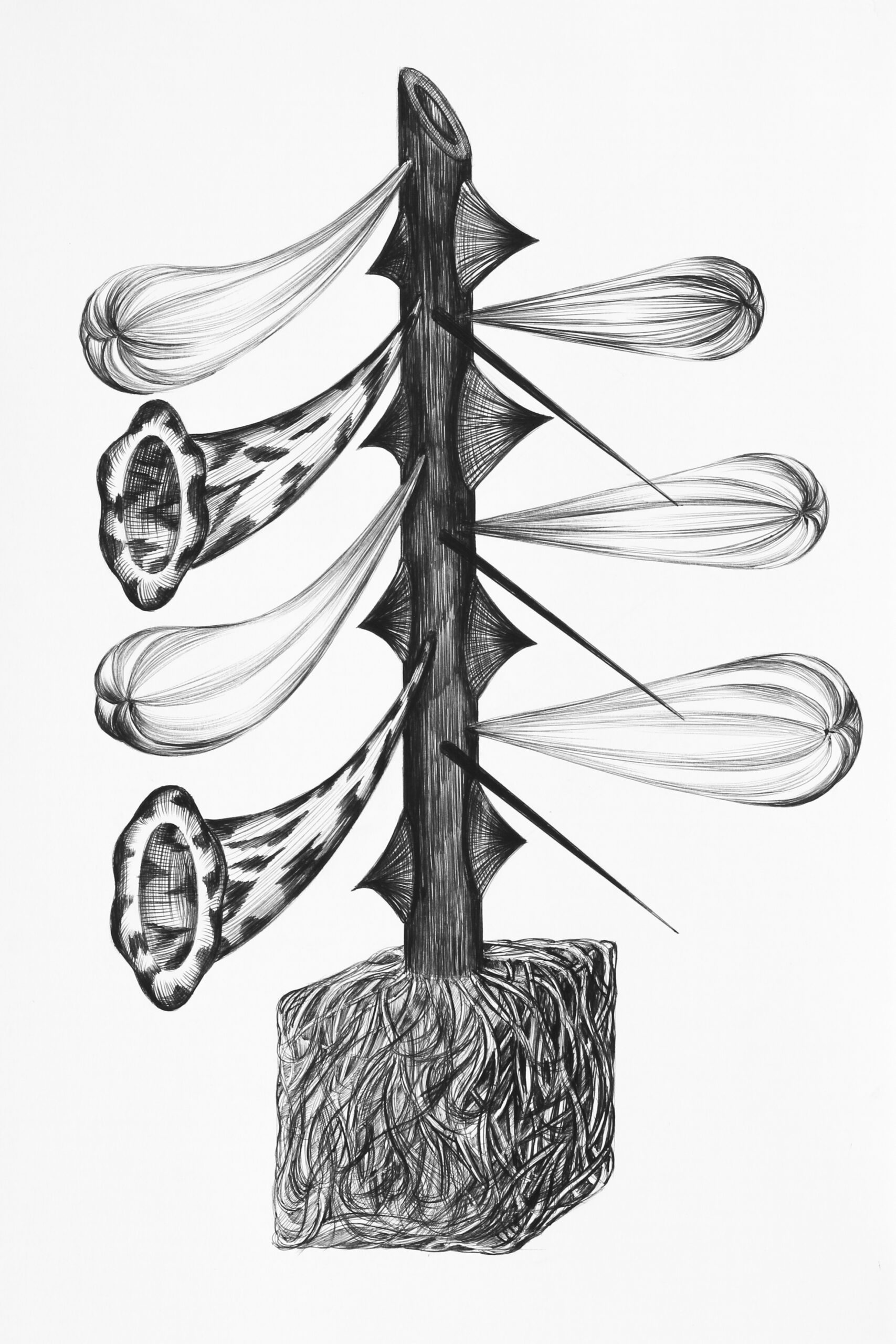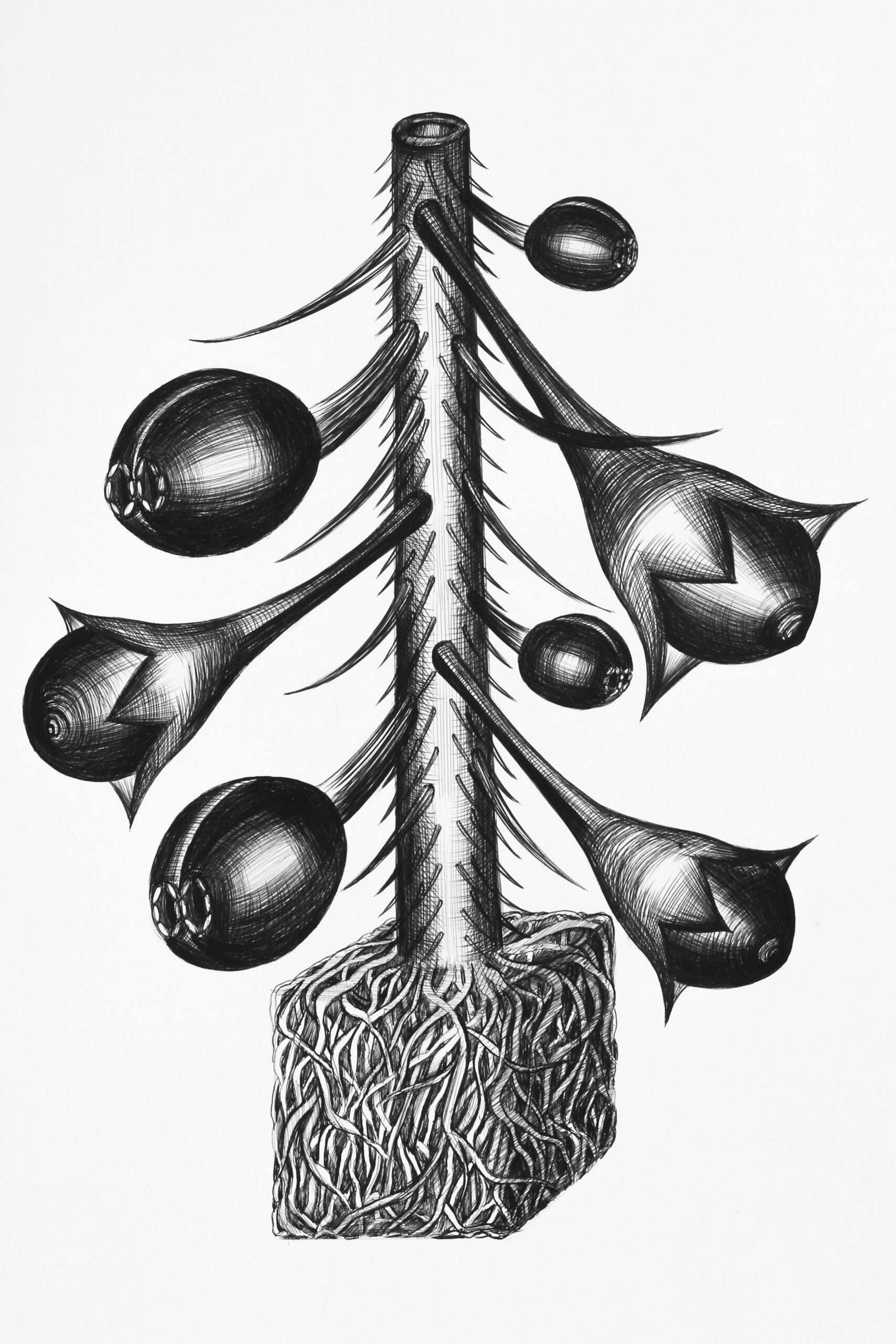 Serie digitale tekeningen van hybride plantmodellen die balanceren tussen natuur en kunstmatigheid,