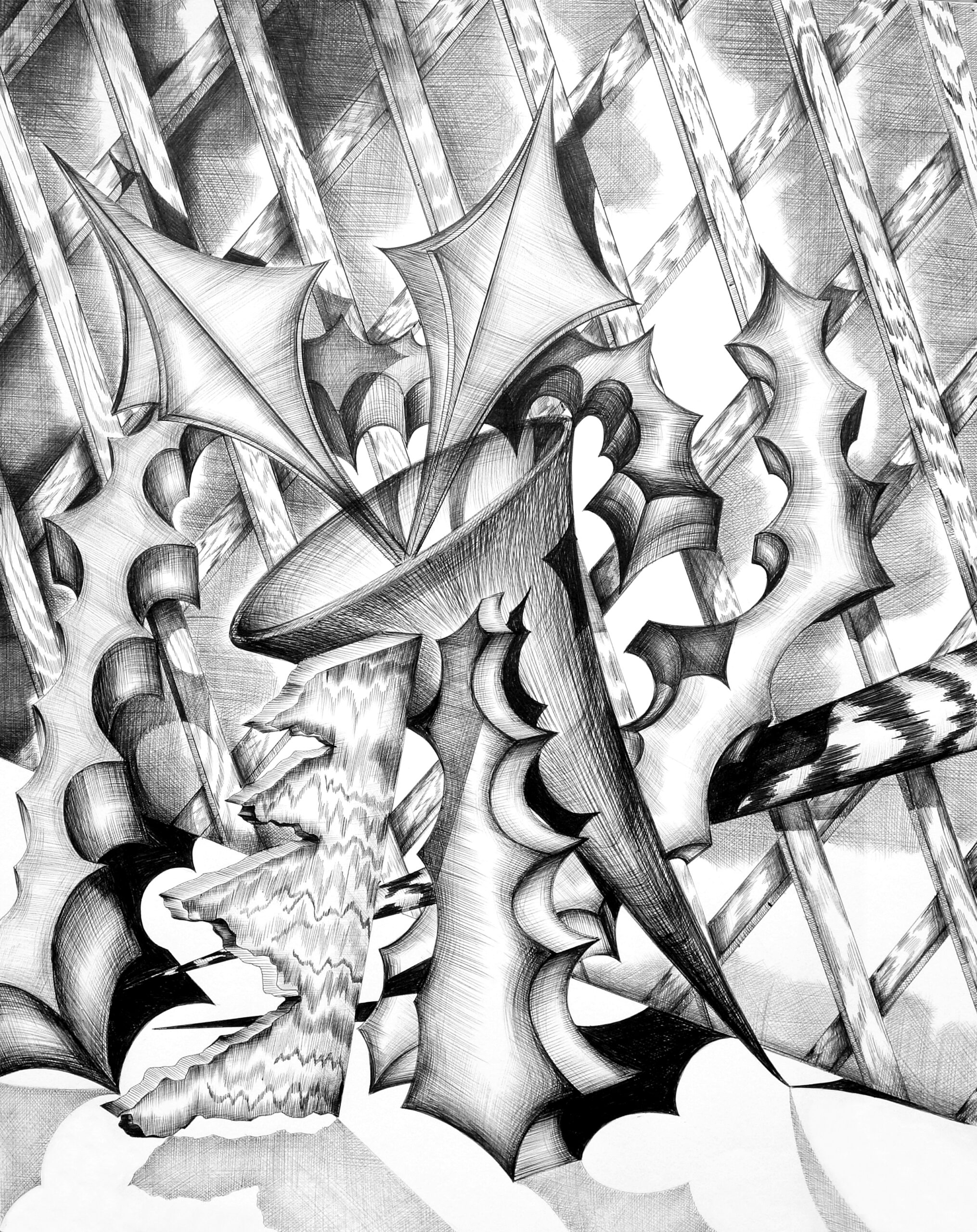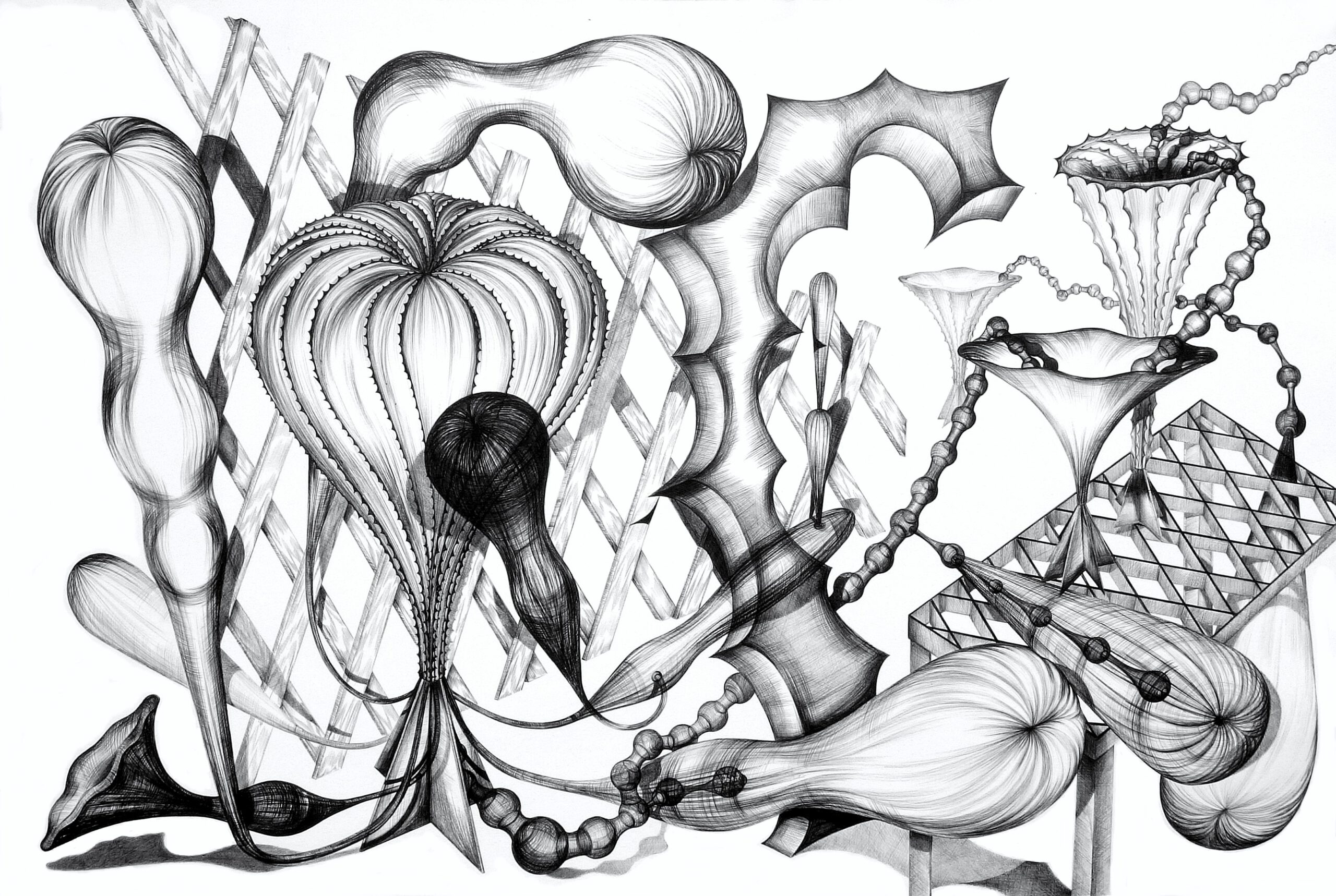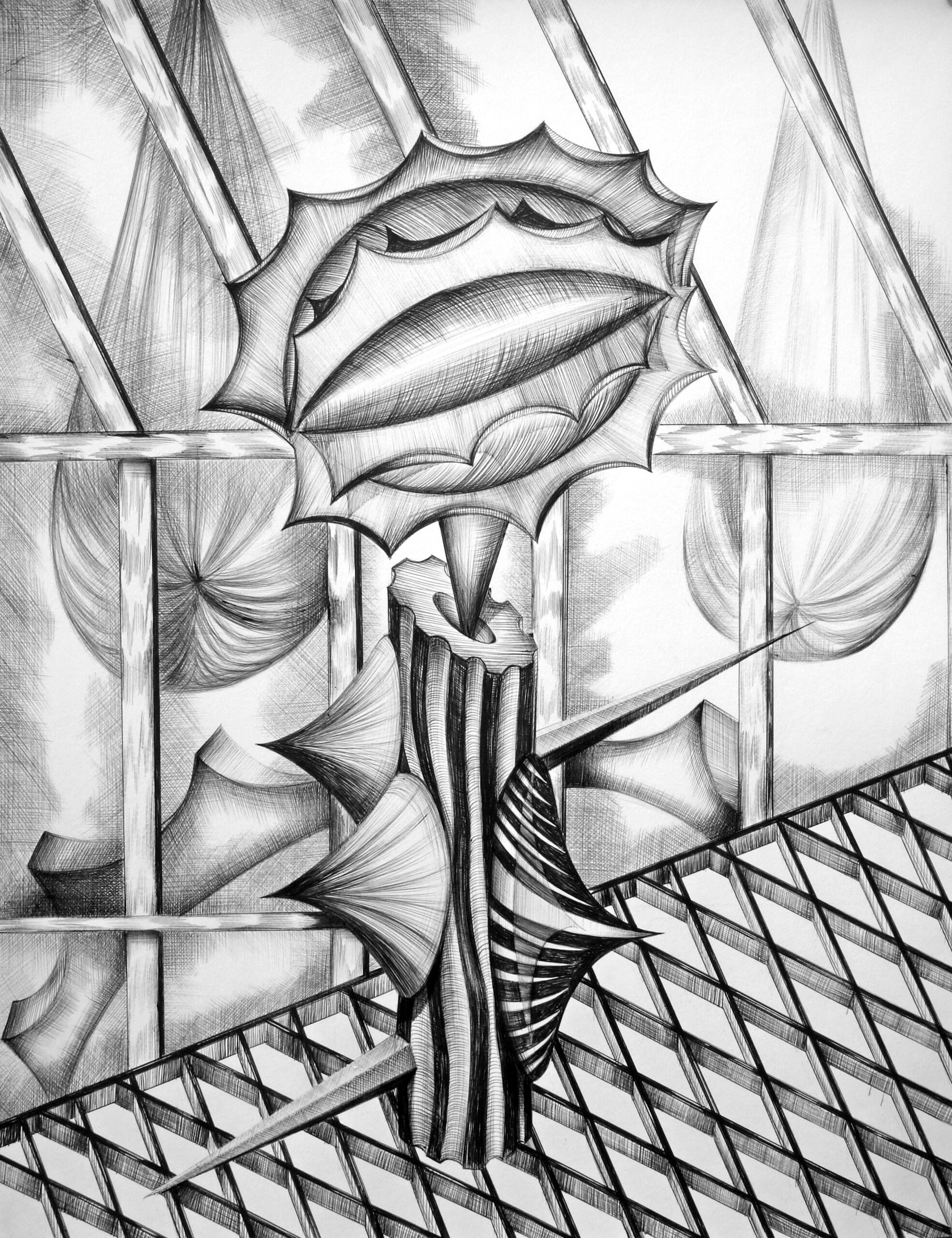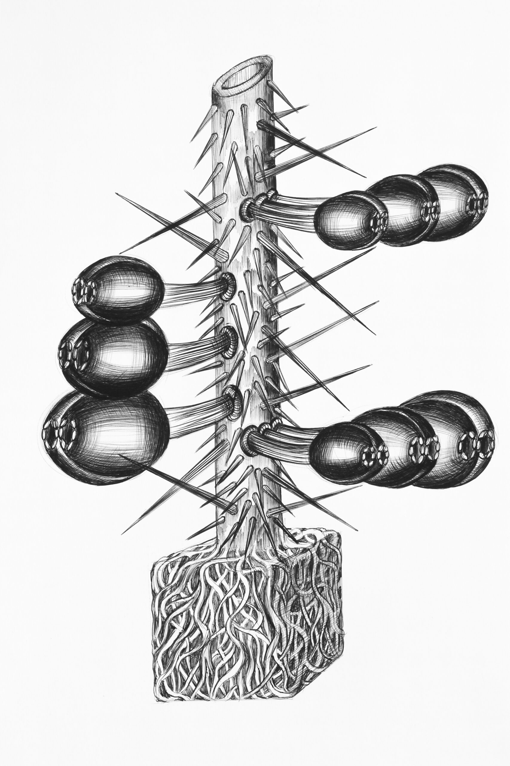 Serie digitale tekeningen van hybride plantmodellen die balanceren tussen natuur en kunstmatigheid,
