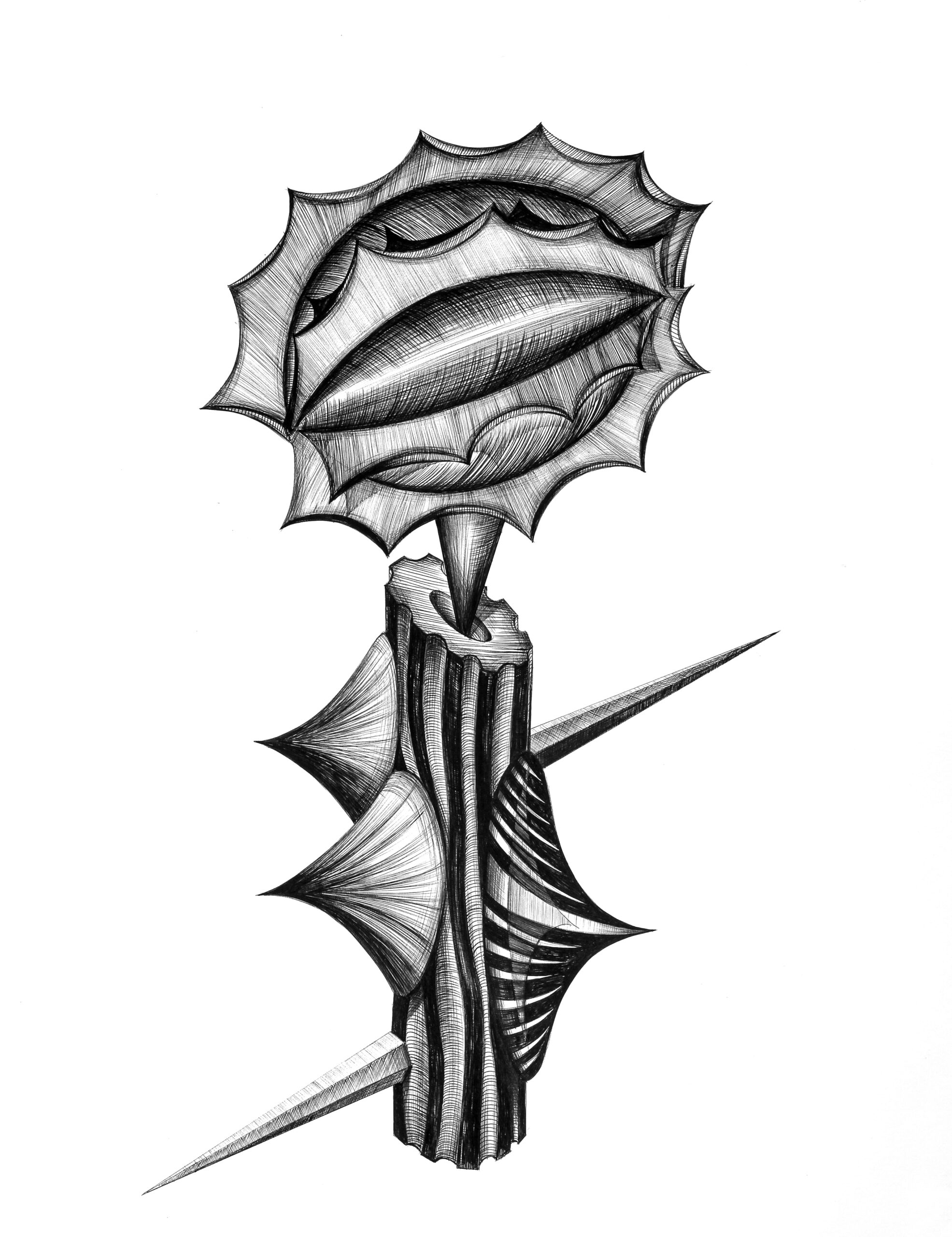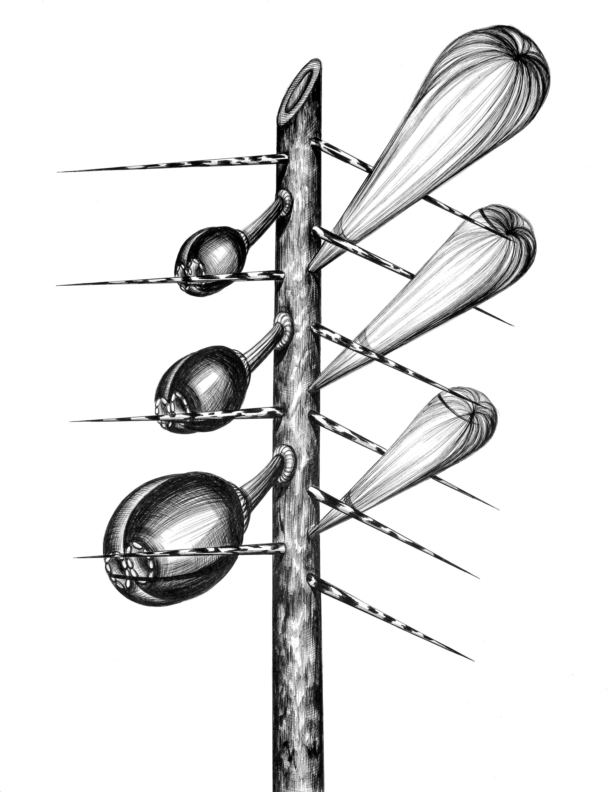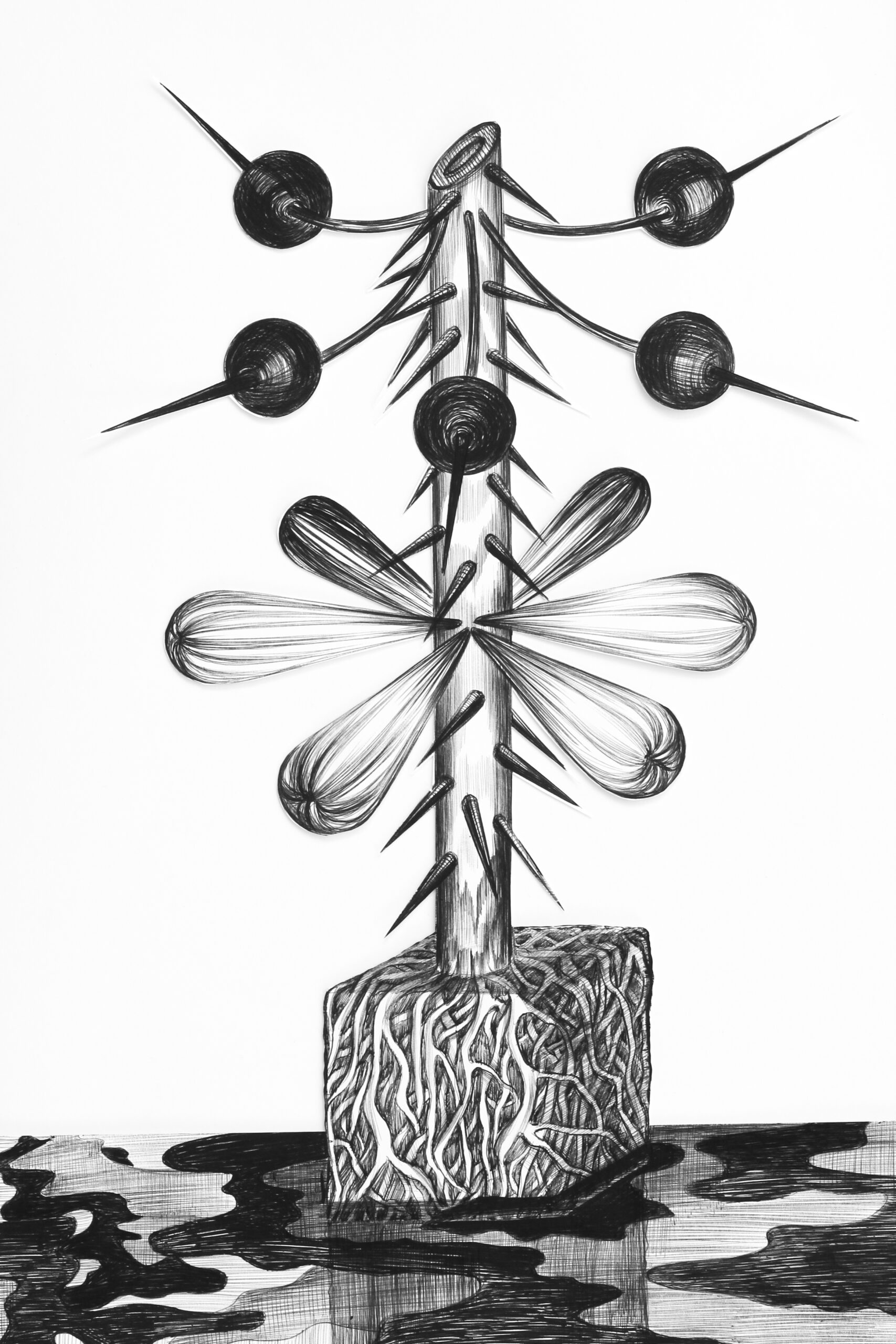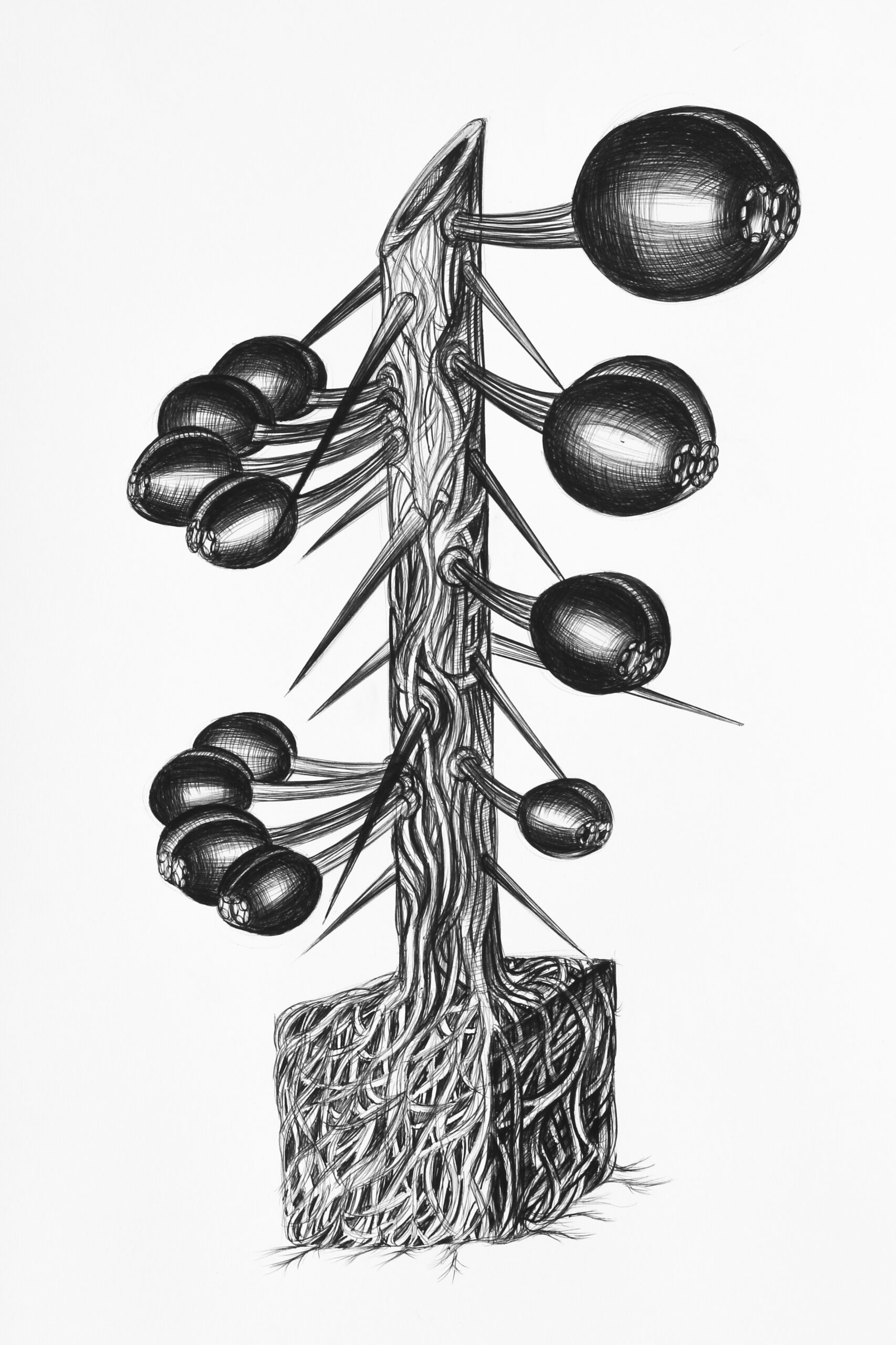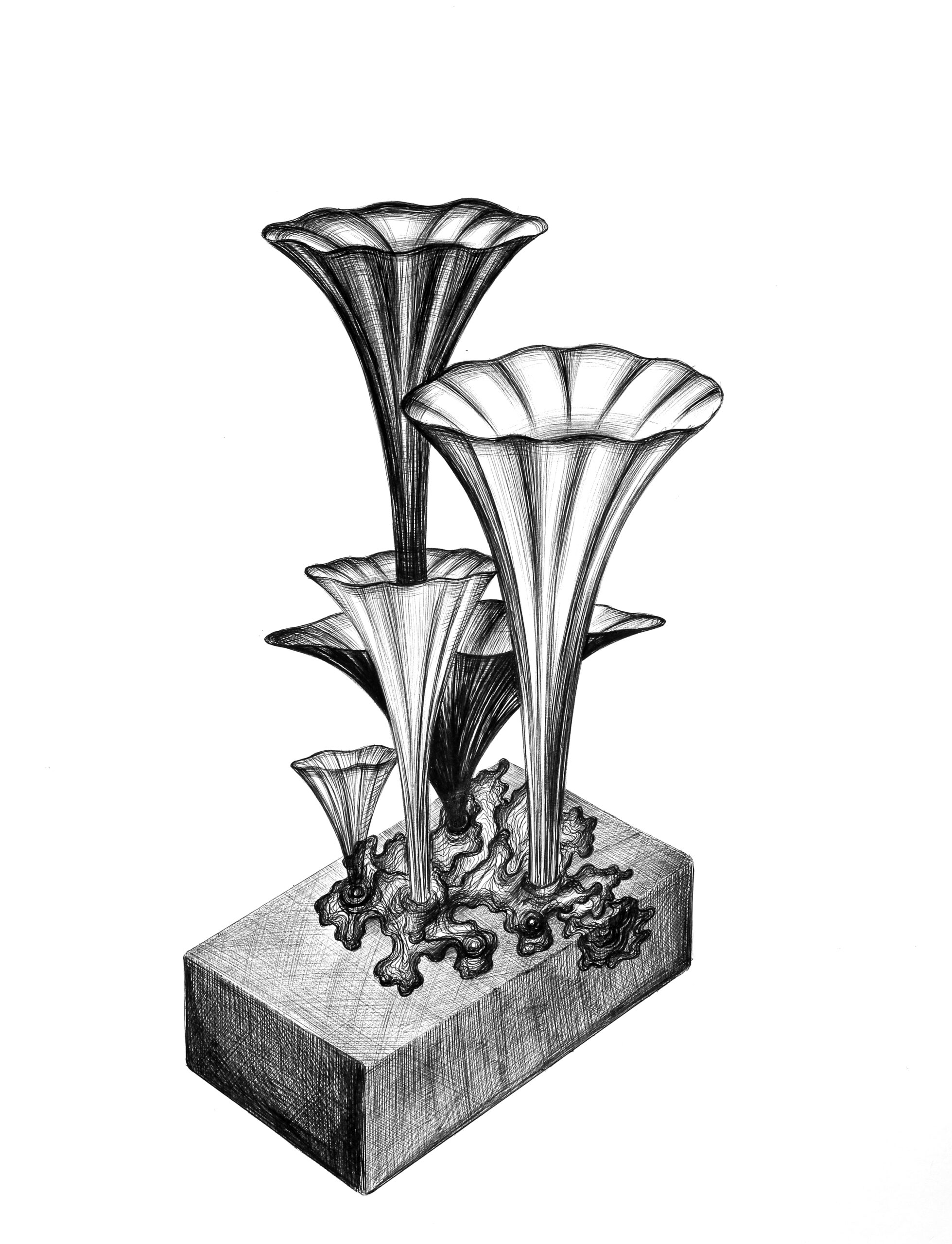 De Flowerbombs zijn statische, onbuigzame artificiële plantmodellen, die hun kracht ontlenen aan hun materiaal metaal.